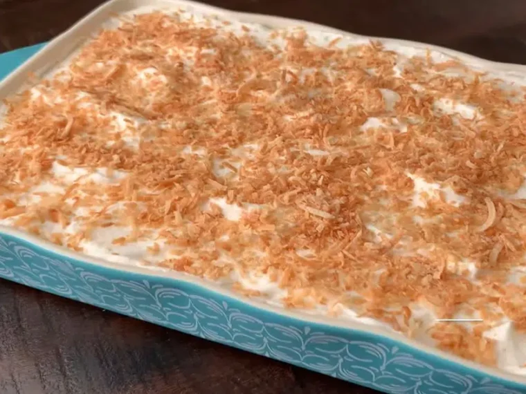 Once the cake has chilled, spread the whipped topping generously over the surface. Smooth it out and sprinkle the toasted coconut on top. If you’re feeling festive, add cherries or pineapple slices. This small act turns your kitchen into a tropical bakery and makes the dessert visually stunning.