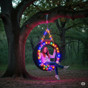 Add a soft cushion inside a horizontal tire, hang it from a sturdy tree, and you’ve got an elevated garden lounger — perfect for kids or adults.