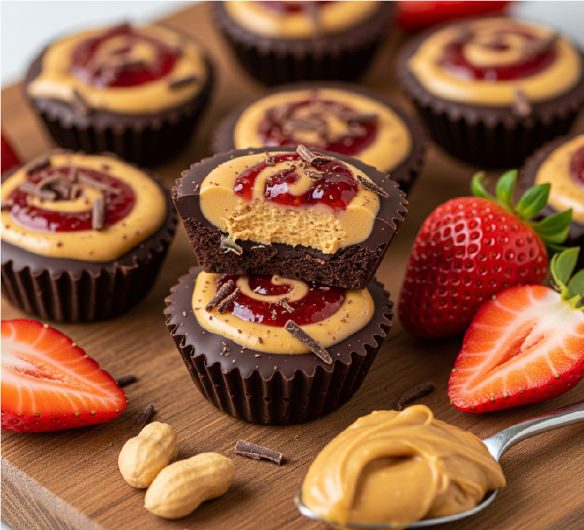 These delightful treats combine the classic flavors of peanut butter and jelly with rich chocolate, all in a convenient, bite-sized cup. They’re perfect for satisfying a sweet craving!