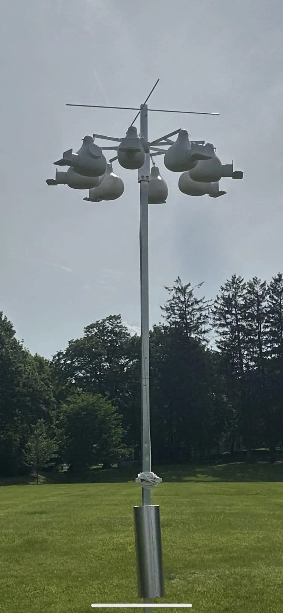 If you’ve recently taken a stroll through your local park or county green space and noticed tall poles dotted with what look like white pods or mysterious “cameras,” you’re definitely not alone in wondering what they are. These poles, standing more than 12 feet high and topped with an array of bulbous structures, seem almost futuristic—like they belong in a sci-fi movie or some secret government surveillance project. But the truth? Those aren’t cameras. Nor are they weather instruments or any kind of high-tech gadget. Instead, they are purple martin gourd houses — an old-school yet highly effective way to support one of North America’s most beloved migratory birds: the purple martin.